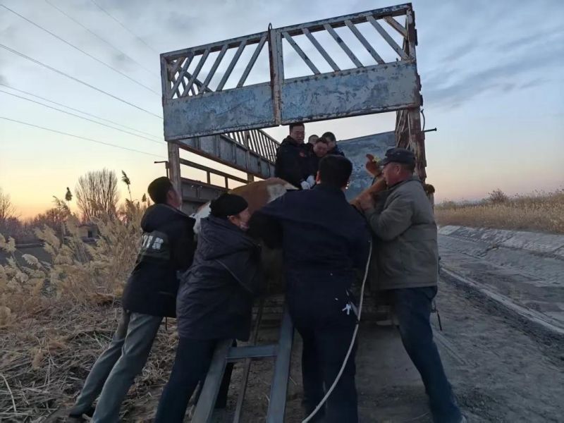 众人一拥而上,用绳子将牛蹄牢牢绑住。要把这头几百公斤重的大牛弄上车并不容易,大家拉的拉、推的推,从接到求助到把牛安全送回家中,整整四个小时的“拉锯战”,终于将这头“倔强”的牛成功运上了车。
