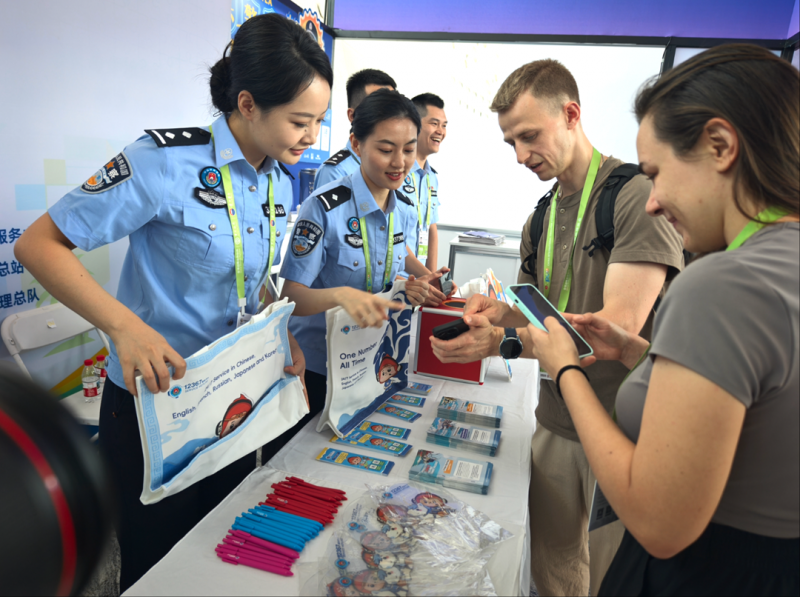当天,来自希腊的参展人员尼克专程来到服务区咨询免签方面的问题。海口边检总站民警陈友浩用流利的英语,围绕外籍人才居留许可、商务签注及出入境便利措施进行了详细讲解,并向他推荐12367服务平台。“只要一个电话,相关政策问题都能第一时间得到解答。”