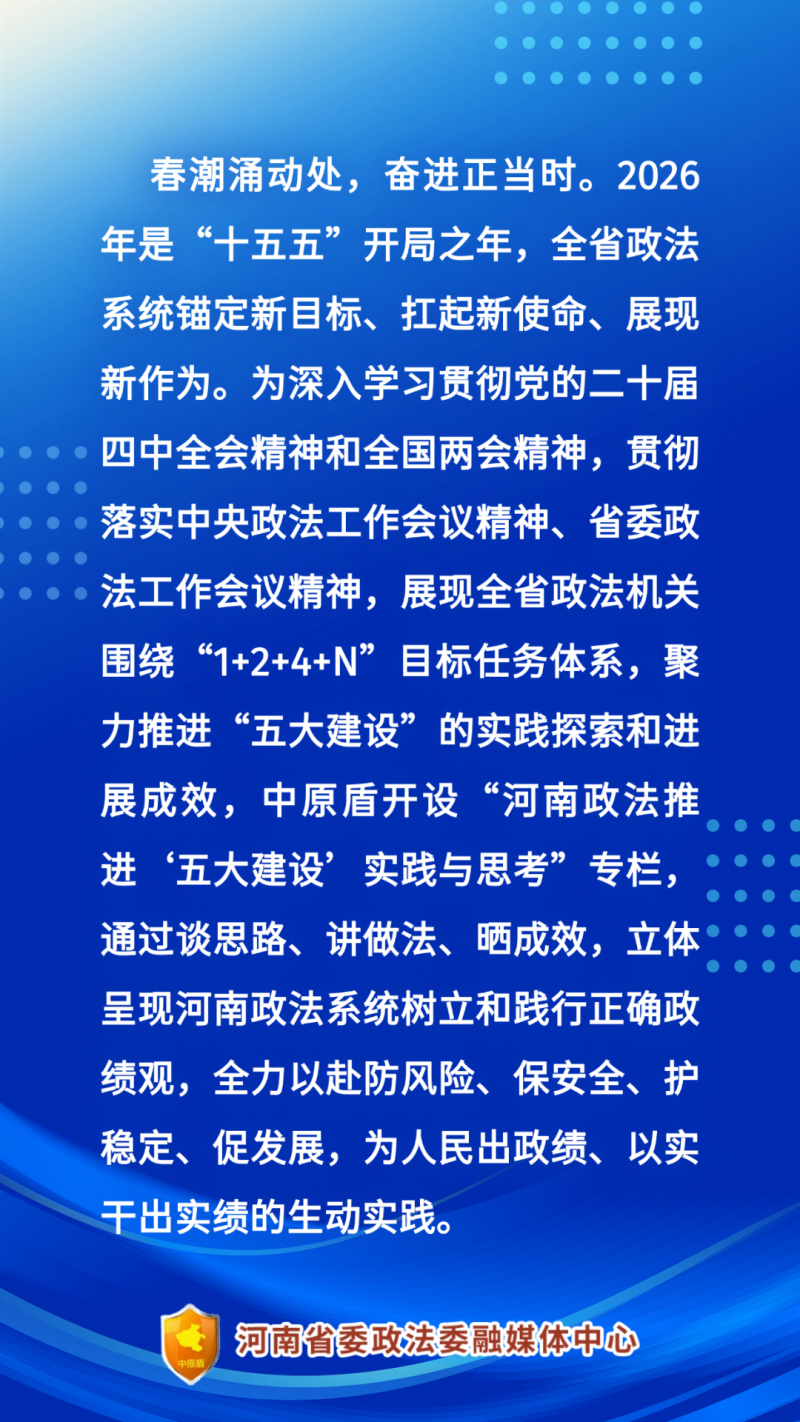 2026年是“十五五”开局之年,安阳市政法系统将紧紧围绕“五大建设”部署要求,坚持统筹发展和安全,以构建高水平安全为目标,以提升高效能治理为路径,以锻造高素质队伍为保障,全力做好防风险、保安全、护稳定、促发展各项工作,为经济社会高质量发展持续营造安全稳定的政治社会环境。