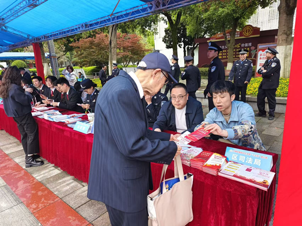 4月15日,岳阳市岳阳楼区司法局联合多家单位,在金鹗山公园东门广场开展全民国家安全教育日集中宣传活动,前来咨询的群众络绎不绝。活动现场通过“一站式法律答疑”,把公检法司及宣传、网信等部门力量拧成一股绳,让群众在散步休闲间上了一堂听得懂、用得上的“公园普法课”。