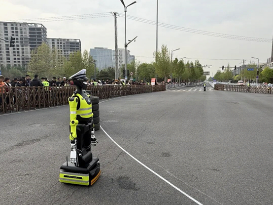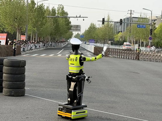 4月19日一早,在2026北京亦庄半程马拉松暨人形机器人半程马拉松比赛的路线上,北京交警机器人首次正式亮相,在赛道指挥选手奔跑,后续将在路口试点执勤,陆续完善并实现更多功能。