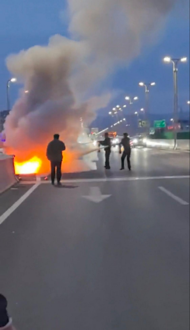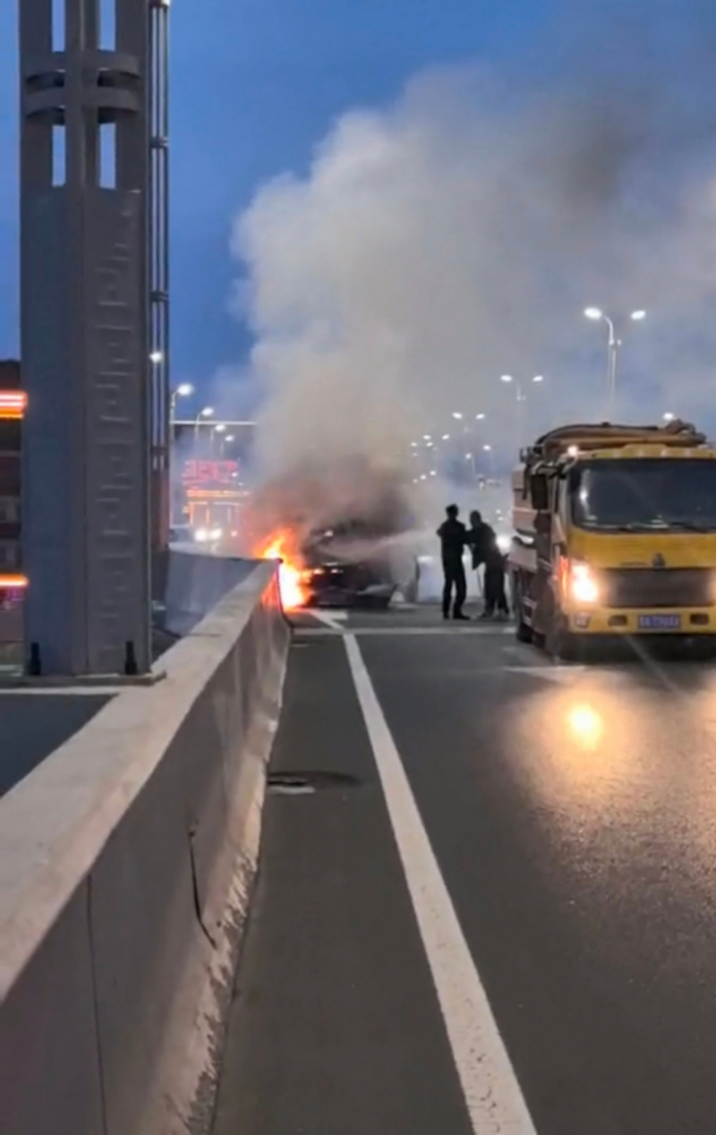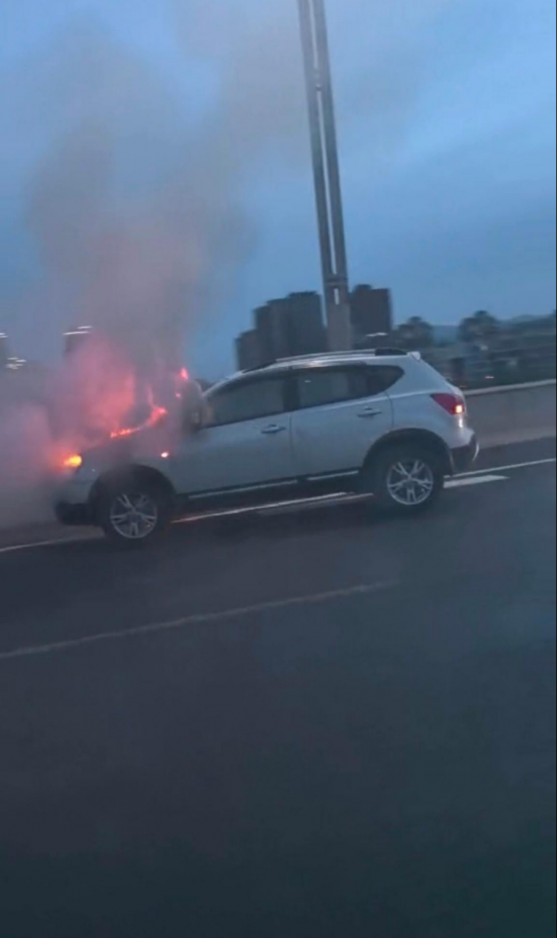 突然,一团火光在桥面上炸开——一辆行驶中的汽车引擎盖冒出浓烟,紧接着火苗蹿了出来。短短数秒,凶猛的火舌便冲破引擎盖,迅速蔓延至驾驶室。火光在夜色中格外刺眼,车辆燃烧发出的“噼啪”声、玻璃炸裂的脆响交织在一起,周边车流瞬间陷入慌乱。