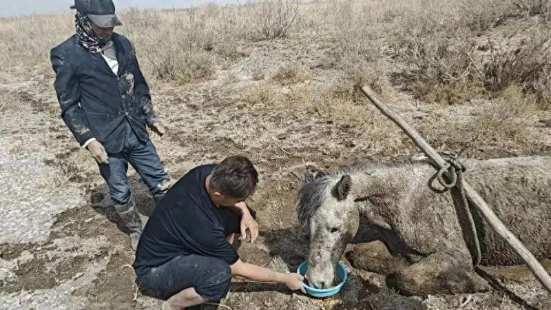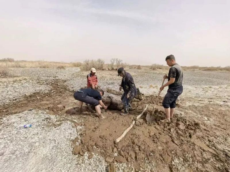4月5日上午9时许,新疆生产建设兵团第十四师和田垦区公安局玉泉派出所接到群众紧急求助报警,其饲养的三匹马深陷泥潭,无力施救。派出所民警辅警立即携带救援装备,火速赶赴现场。