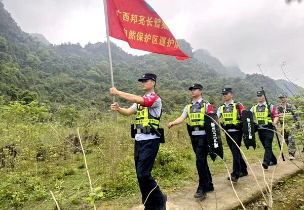 近年来,壬庄边境派出所在保护区内建设“生态枫警”警务室,联合成立全国首支东黑冠长臂猿保护队伍“广西邦亮长臂猿国家级自然保护区巡护队”,不断扩大群防群治队伍,形成维护生态安全,维护边境稳定的强大合力。通过强化案件打击,加强主动预防,推动综合治理等系列举措,保护区及周边村屯治安持续稳定,已连续10年实现“零盗猎”“零滥伐”和“零违建”。如今,保护区内的东黑冠长臂猿种群数量已从发现之初的3群19只,增长至5群39只,成功实现从濒临灭绝到种群稳定繁衍的蝶变。